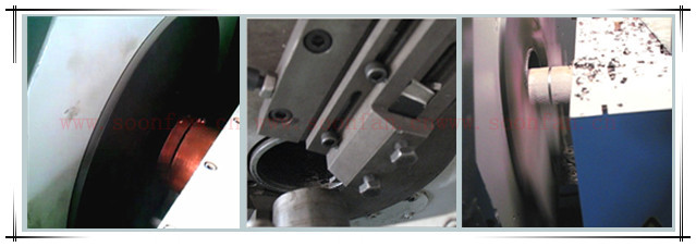 這是一臺專門針對大口徑管切斷研發(fā)的全自動切管機,用旋轉(zhuǎn)刀方式切管,切管時工件不轉(zhuǎn)動,刀具旋轉(zhuǎn)進行削切,隨著刀具每旋轉(zhuǎn)一圈逐步進刀,從管外徑層層削切至管外徑達到切斷圓管的作用。和車床切管方式相反。設(shè)備用雙伺電機控制進刀,進刀穩(wěn)定,特別適用于大口徑管如氧氣瓶等壓力容器管的切斷。