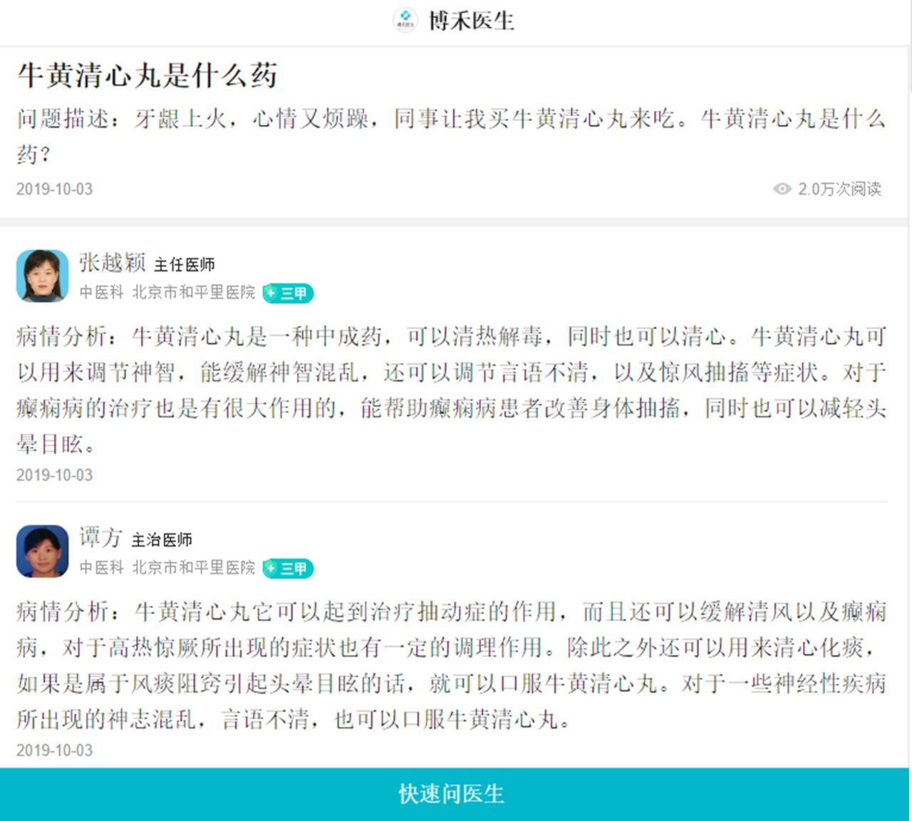 其實每一天在我們的醫(yī)療遠程系統(tǒng)里面,全國都會有上千的人來咨詢牛黃清心丸。各位名醫(yī)大家遠程去解答大家的問題,為大家排憂解難,為我們的健康保駕護航。尤其是負責牛黃清心丸的解答。下面我們可以看到這些圖片,都是名醫(yī)專家在回復咨詢者在咨詢牛黃清心丸。